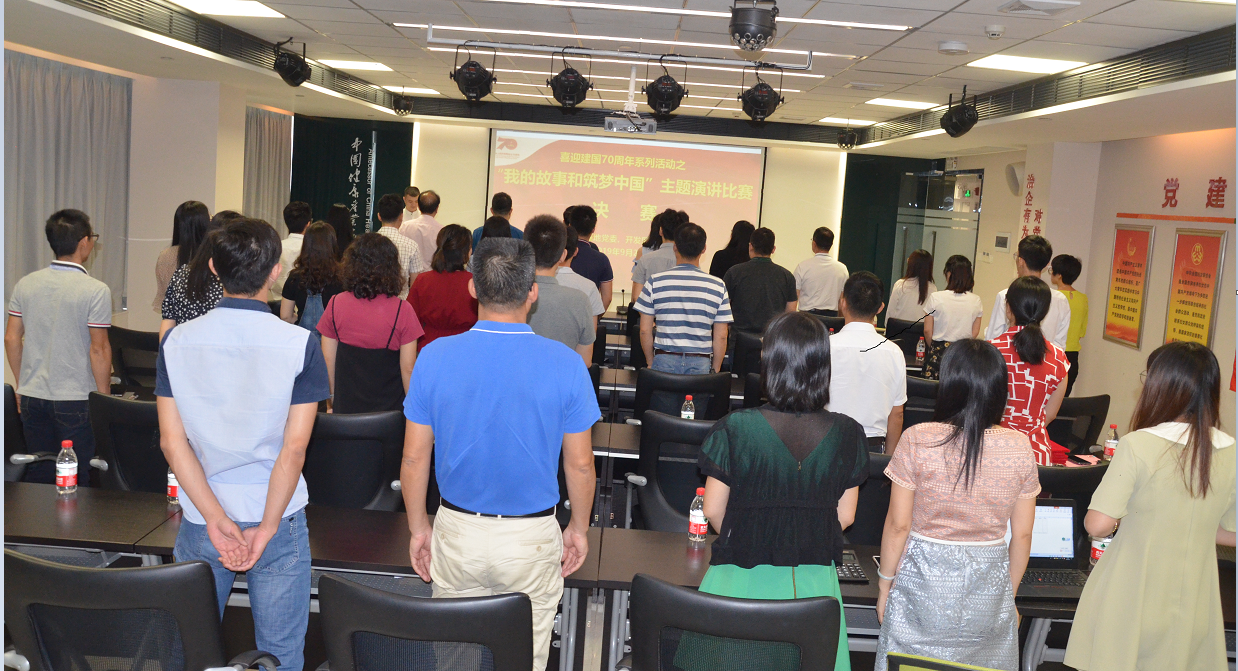 ▲全員起立及合唱國歌 此次演講比賽由國家健康基地黨委、開發(fā)區(qū)團(tuán)工委主辦,健康基地工聯(lián)會(huì)、健康基地兩新黨支部及健康基地團(tuán)委協(xié)辦,是健康基地“喜迎建國70周年”系列活動(dòng)之一。在8月29日舉辦的初賽中,來自園區(qū)10個(gè)企業(yè)的21名選手最終有12名進(jìn)入決賽。