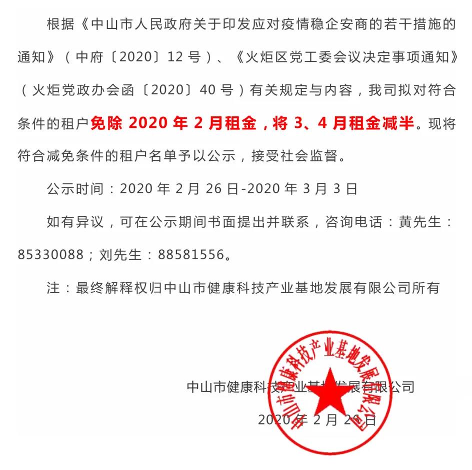 中山市健康科技產業(yè)基地發(fā)展有限公司關于經營性物業(yè)、土地租金減免名單的公示
