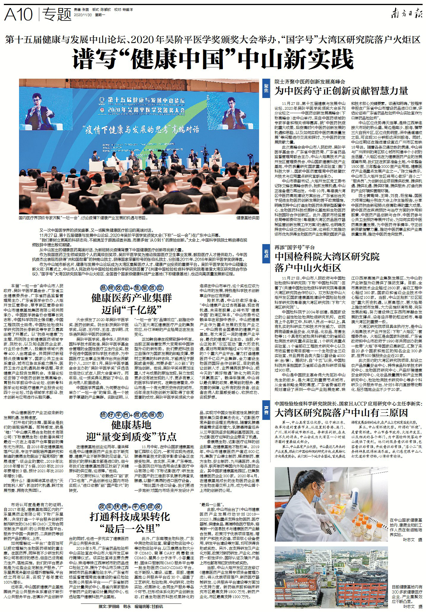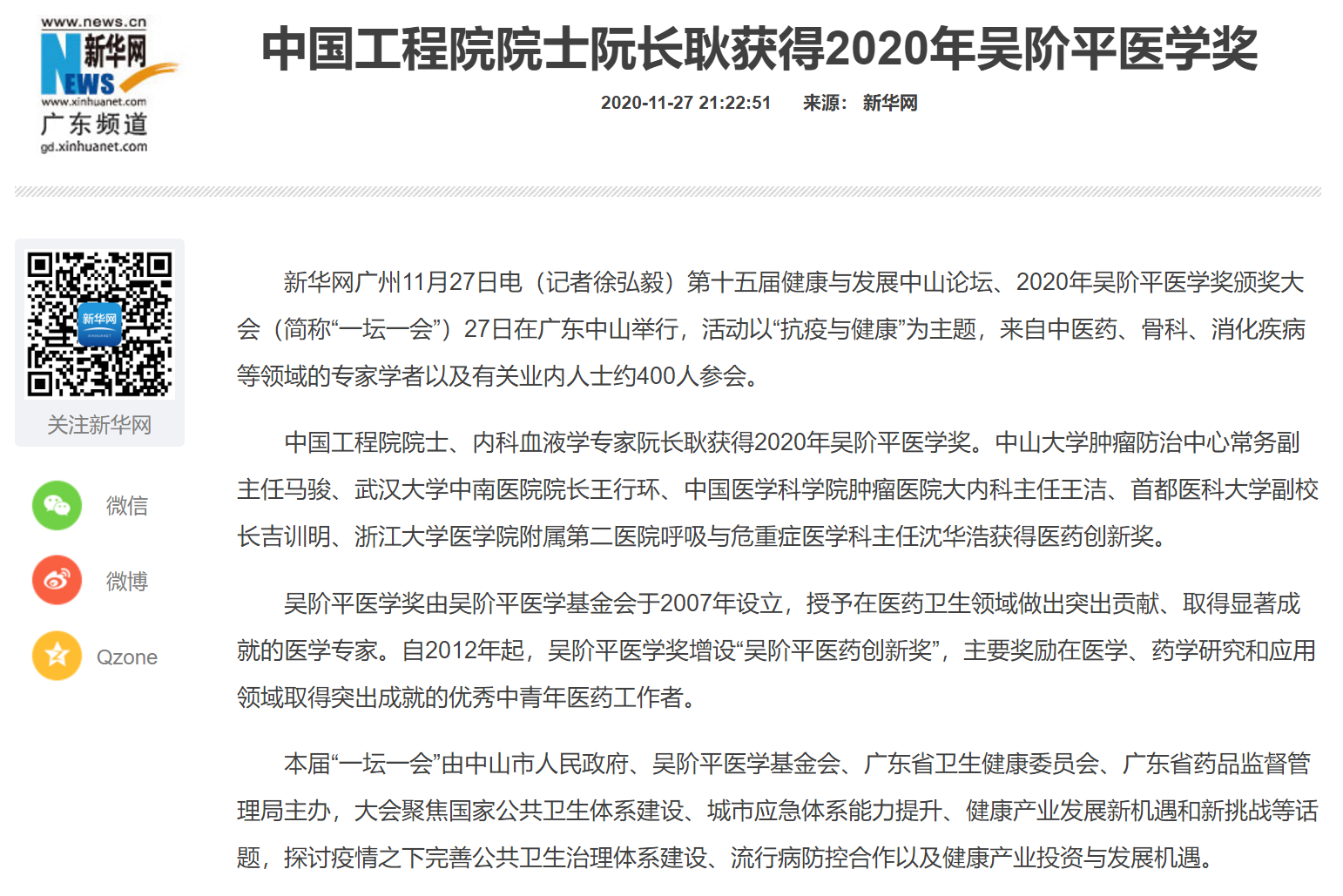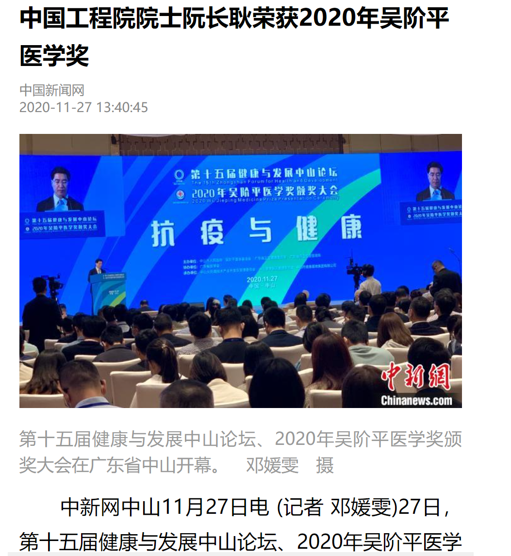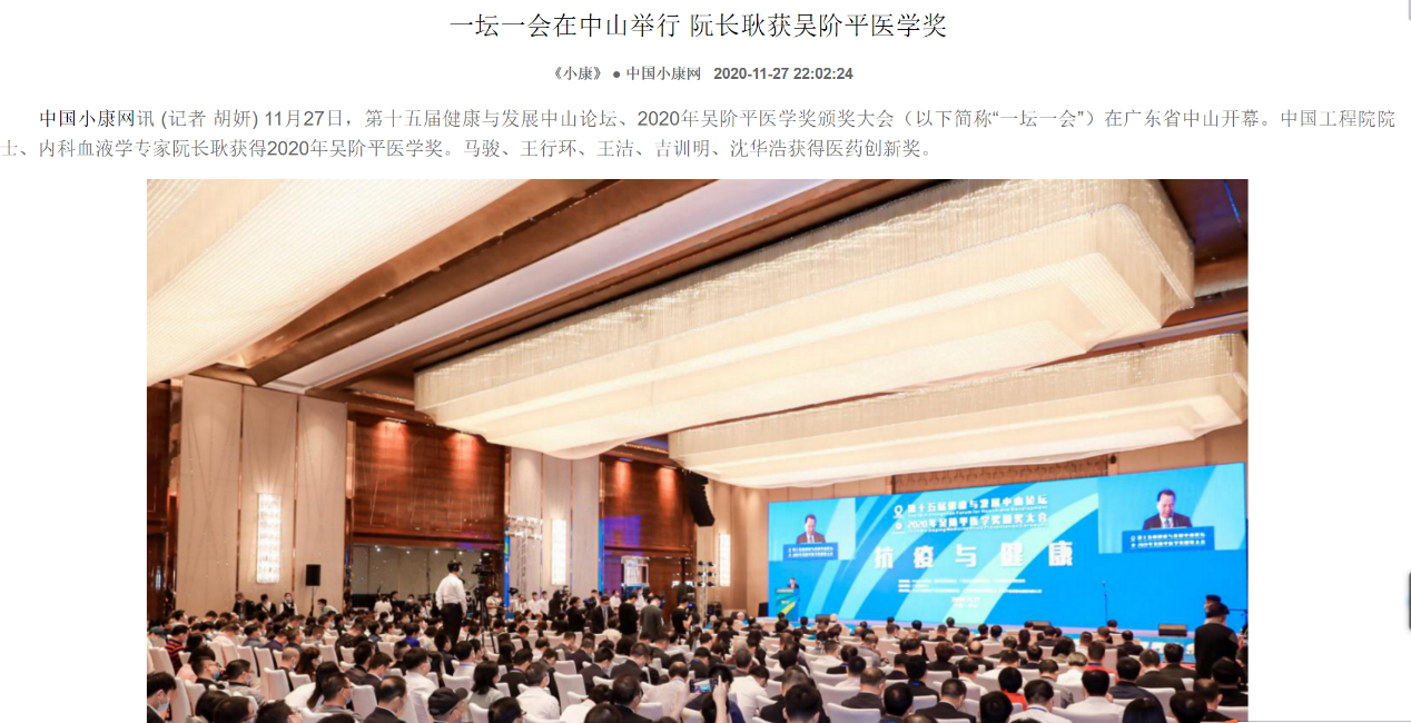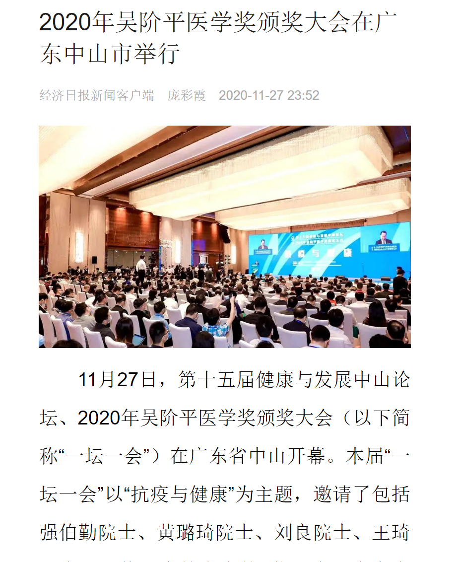 11月27日,第十五屆健康與發(fā)展中山論壇、2020年吳階平醫(yī)學(xué)獎(jiǎng)?lì)C獎(jiǎng)大會(huì)(以下簡(jiǎn)稱“一壇一會(huì)”)在廣東省中山開幕。大會(huì)取得圓滿成功,人民日?qǐng)?bào)、新華網(wǎng)、中國新聞社、科技日?qǐng)?bào)、經(jīng)濟(jì)日?qǐng)?bào)等央媒,醫(yī)藥經(jīng)濟(jì)報(bào)、健康界等行業(yè)媒體,南方日?qǐng)?bào)、羊城晚報(bào)等省級(jí)媒體,中山日?qǐng)?bào)、中山電視臺(tái)等都對(duì)大會(huì)進(jìn)行了詳細(xì)報(bào)道。