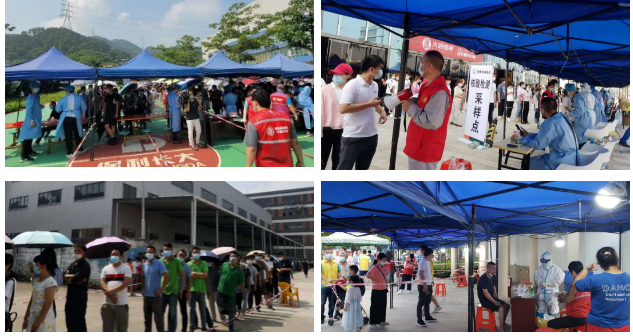 美味鮮、百靈、樂心醫(yī)療、九州通、武藏精密、利誠檢測、未名海濟、中智藥業(yè)、星昊藥業(yè)等企業(yè)紛紛派出志愿者積極參與服務(wù)及現(xiàn)場秩序維護,并主動提供照明燈、桌椅、冷風機等物資保障。華銀、九州通、利誠檢測、百靈生物等企業(yè)派出志愿者負責全區(qū)58個采樣點的樣本回收工作。得益于有力的組織,在理順流程后,下午檢測效率較上午更高,人均檢測耗時從進場到離開約10分鐘。