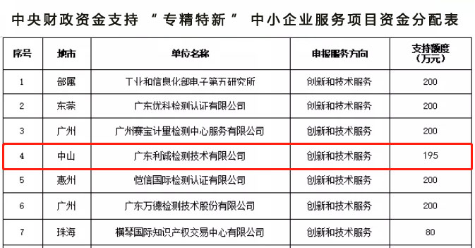 從服務(wù)項目資金分配表上看到,全省獲支持的共有19個項目。利誠檢測申報方向為“創(chuàng)新和技術(shù)服務(wù)”。