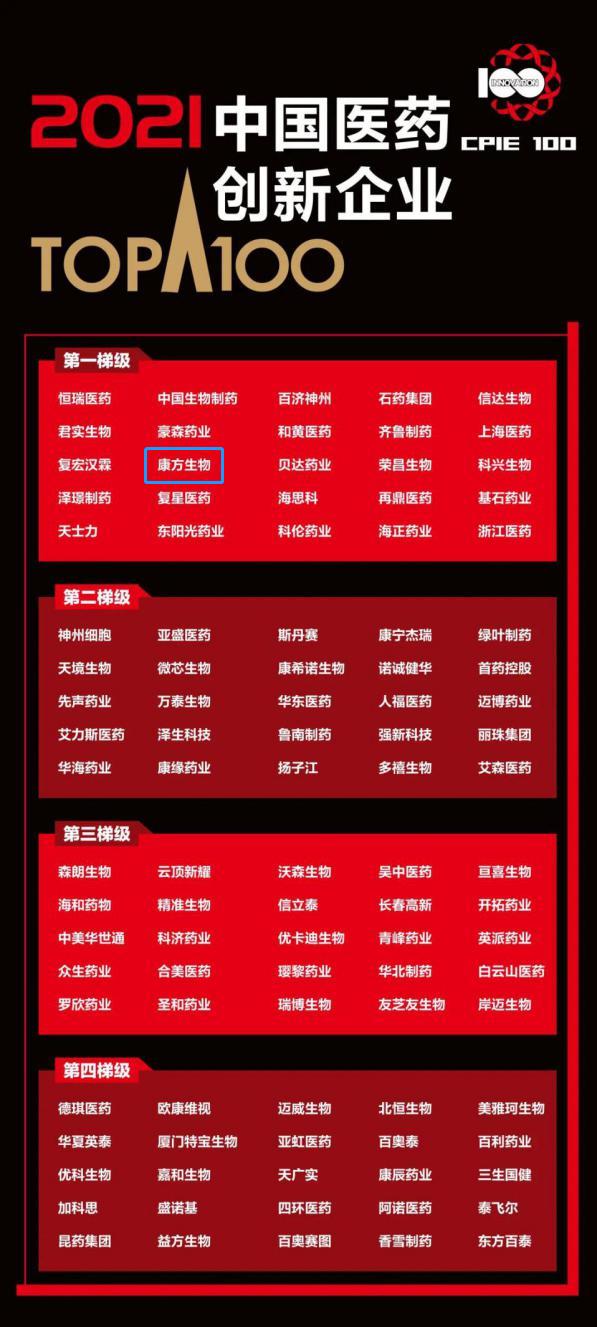 康方生物入選“中國醫(yī)藥創(chuàng)新企業(yè)100強(qiáng)”第一階梯