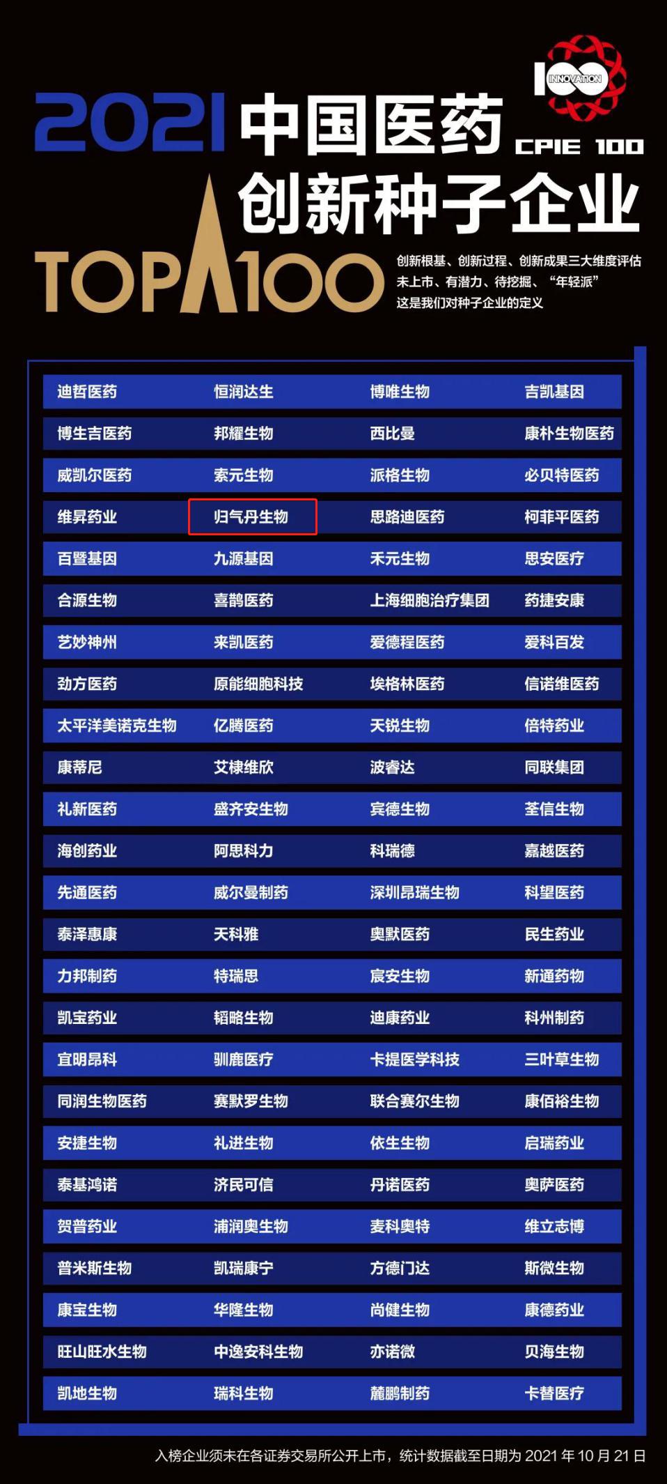 歸氣丹生物入選“2021中國醫(yī)藥創(chuàng)新種子企業(yè)100強(qiáng)”