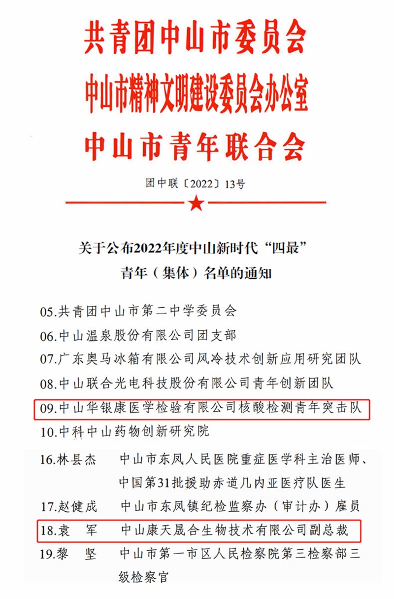 在團市委、市文明辦、市青聯(lián)開展的2022年度中山市新時代“四最”青年(集體)評選工作中,健康基地園區(qū)企業(yè)中山華銀康醫(yī)學檢驗有限公司核酸檢測青年突擊隊和中山康天晟合生物技術有限公司副總裁袁軍榜上有名。