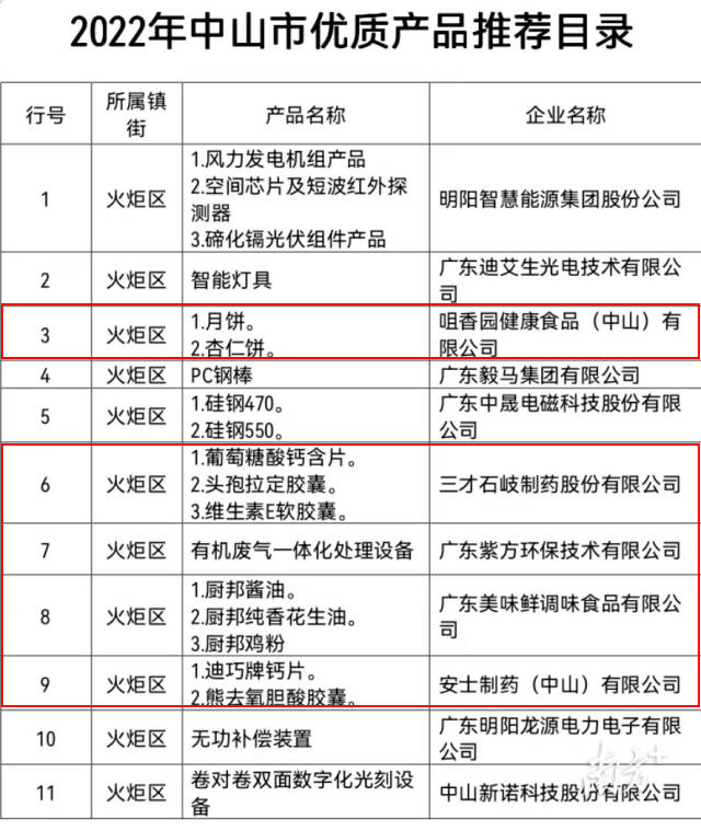 本次上榜的企業(yè)基本涵蓋了中山市內(nèi)主要知名企業(yè)及其“拳頭”產(chǎn)品。如在食品類方面,包括咀香園健康食品(中山)有限公司的杏仁餅、廣東美味鮮調(diào)味食品有限公司廚邦醬油等。健康醫(yī)藥領(lǐng)域,包括安士制藥(中山)有限公司的迪巧牌鈣片、三才石岐制藥股份有限公司的葡萄糖酸鈣含片;工業(yè)產(chǎn)品領(lǐng)域,包括廣東紫方環(huán)保技術(shù)有限公司有機廢氣一體化處理設(shè)備等。