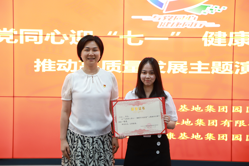 健康基地集團(tuán)園區(qū)黨委書記、總經(jīng)理萬鶴群為優(yōu)秀獎獲得者劉婉思(投資部)、郭培鑫(工程部)、楊卓星(經(jīng)濟(jì)發(fā)展部)、劉賢進(jìn)(招商二部)頒獎