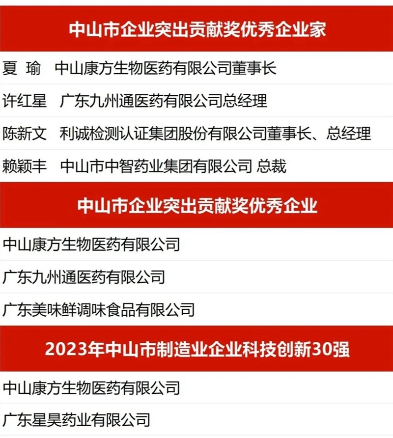 健康基地園區(qū)4位企業(yè)家獲評(píng)“中山市企業(yè)突出貢獻(xiàn)獎(jiǎng)優(yōu)秀企業(yè)家 ”、3家企業(yè)榮獲“中山市企業(yè)突出貢獻(xiàn)獎(jiǎng)優(yōu)秀企業(yè)”、2家企業(yè)入選“2023 年中山市制造業(yè)企業(yè)科技創(chuàng)新30強(qiáng)”。