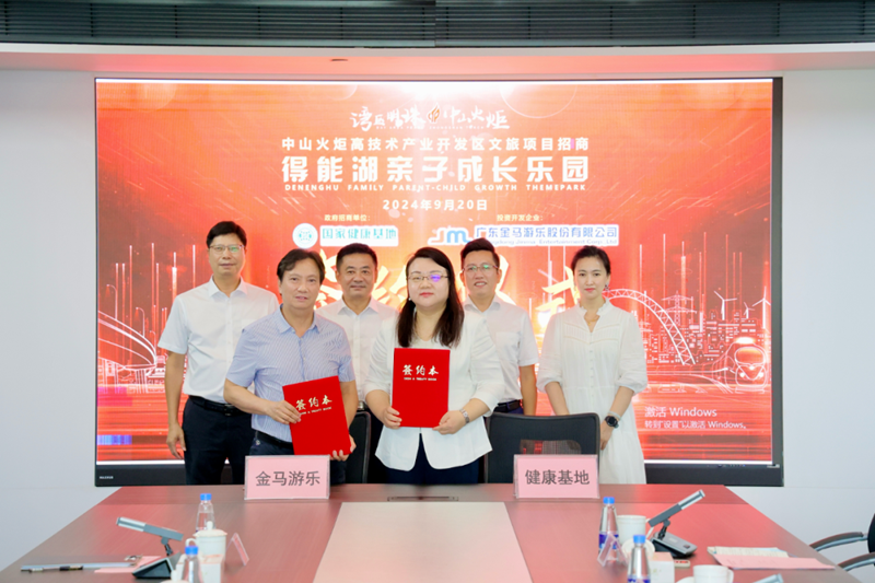 “城市會客廳+科技游樂”的創(chuàng)新型親子文旅項目等即將落地得能湖公園!9月20日,中山市健康基地集團有限公司與廣東金馬游樂股份有限公司(下稱:金馬游樂)簽訂“得能湖親子成長樂園”文旅項目投資協(xié)議。中山港街道黨工委副書記胡楠,區(qū)宣傳辦(教體文旅局)主任(局長)李建英、副主任(副局長)譚海波,健康基地集團總經(jīng)理萬鶴群、總經(jīng)理助理涂莉,金馬游樂集團董事長鄧志毅、副總經(jīng)理李勇、副總經(jīng)理曾慶遠,中山市金馬文旅發(fā)展有限公司文旅開發(fā)總監(jiān)陳弢出席了活動。